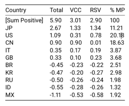 또한 주목할 점은, 모크레(Mokre)와 이스카라(Isikara)의 분석에 따르면 자본 구성비(VCC)의 개선과 높은 잉여가치율(RSV)이 가치 이전에서 동일하게 중요한 역할을 한다는 점이며, 이는 나와 카르케디(Carchedi)가 도출한 결과와도 유사하다. 특히 중국의 경우, 순손실국에서 순수혜국으로의 전환은 거의 전적으로 높은 투자율과 기술 진보―즉 상승하는 자본 구성비(VCC)―에 기인했다.