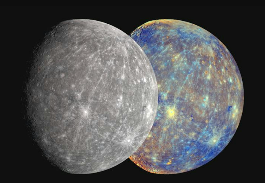 왼쪽에는 NASA의 메신저(Messenger) 탐사선이 촬영한 수성의 모습이 보이고, 오른쪽에는 인간의 눈으로 보았을 때의 실제 색감에 가까운 수성의 모습을 재현한 이미지가 나타나 있다. 출처: NASA/존스 홉킨스 응용물리연구소(Johns Hopkins University Applied Physics Laboratory)/워싱턴 카네기 연구소(Carnegie Institution of Washington)