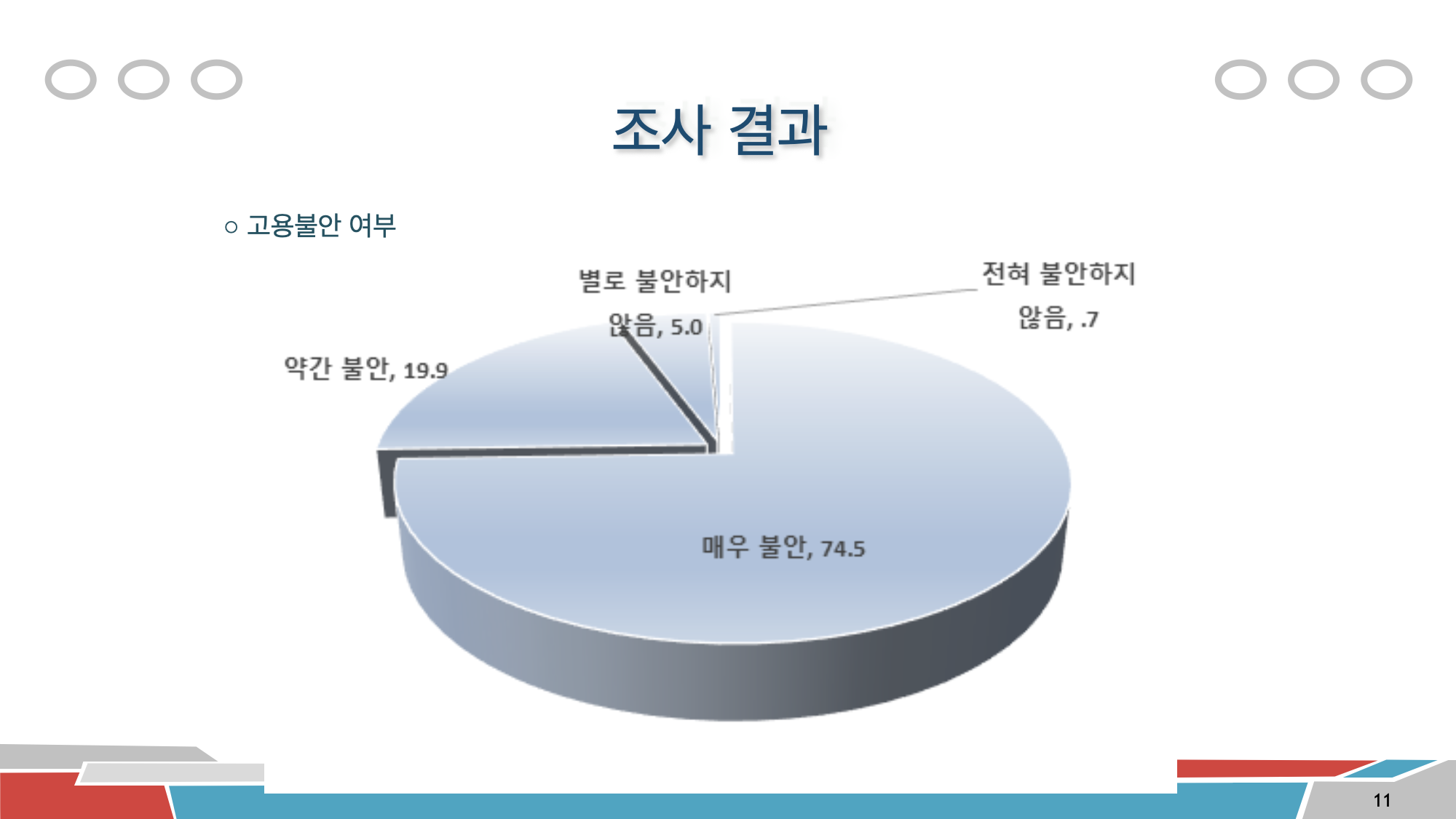 응답자의 평균 연령은 52.7세, 평균 근속 기간이 21.6년으로 KT에 "청춘을 바쳐온" 노동자들이었다. 조사 결과 이들은 심각한 고용불안에 시달리고 있는 것으로 나타났다. 응답자의 74.5% 고용이 매우 불안하다고 응답했다. 고용불안을 느끼는 주된 이유에 대해 '매우 그렇다(1점)'부터 '전혀 그렇지 않다(4점)'까지 4점 척도로 물었을 때, "평가 결과에 따라 언제든지 재배치될 수 있기 때문에(1.3점)", "KT는 수시로 구조조정을 하고 있기 때문에(1.1점)", "강제 근무지(지역) 전환배치를 할 수 있기 때문에(1.3점)"라는 세 가지 이유에 대한 평균 점수 모두가 '매우 그렇다(1점)'에 가까워, 대규모 구조조정이 노동자들에게 일상적 고용불안을 느끼도록 하고 있음이 드러났다.
