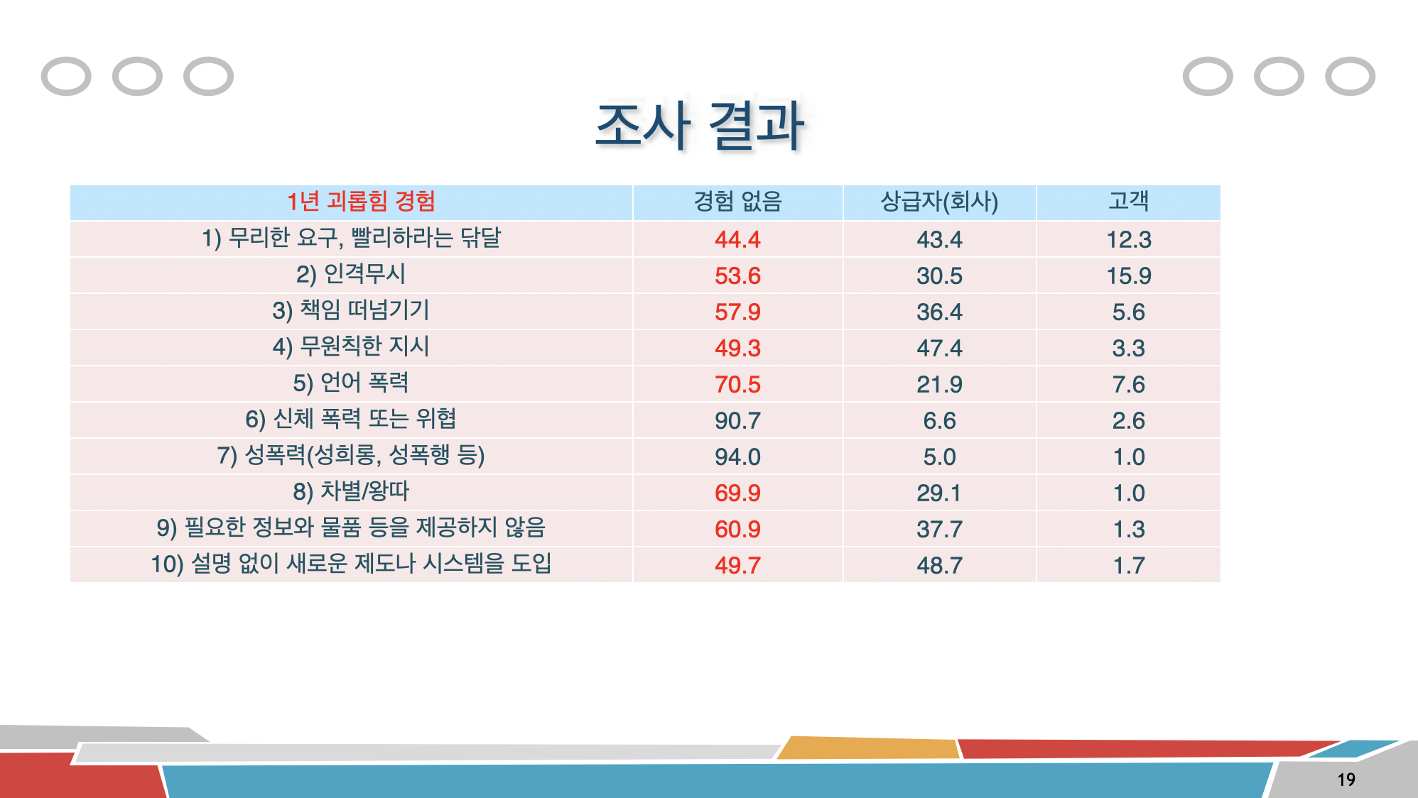 지난 1년간 직장 내 괴롭힘의 경험을 묻는 질문에서는 절반 이상이 '무리한 요구, 빨리하라는 닦달'(55.6%)과 '무원칙적인 지시'(50.7%)를 경험했고, '인격 무시(46.4%), '책임 떠넘기기'(42.1%)를 경험한 경우가 절반에 가까웠다. 10명 중 세 명이 '차별 혹은 왕따(30.1%)'를 경험했고, '필요한 정보와 물품 등을 제공하지 않았다'는 경험도 39.1%나 나타났다. 응답자의 29.5%는 '언어폭력'을 경험하기도 했는데, 이들 직장 내 괴롭힘의 가해자의 대부분은 고객이 아닌 회사의 상급자인 것으로 나타났다.