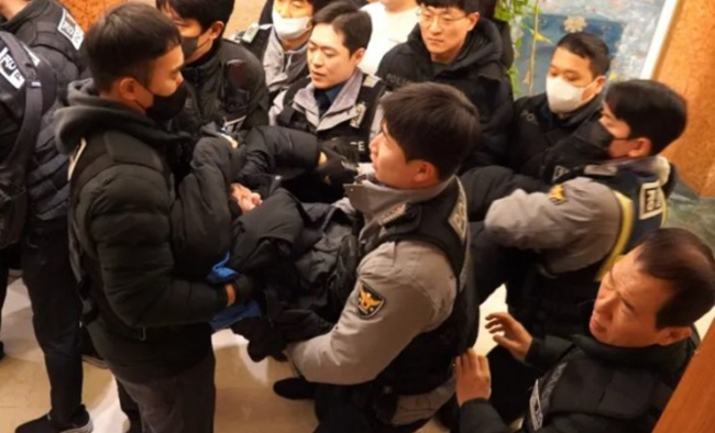 대통령의 경남 타운홀미팅 나흘 전인 2월 2일 경찰이 서울 세종호텔에서 고진수 지부장을 연행하고 있다. 출처: 세종호텔 정리해고 철회를 위한 공동대책위원회