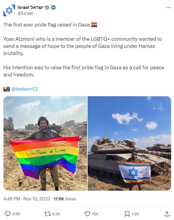 이스라엘의 31세 게이 군인 요아브 아츠모니(Yoav Atzmoni)는 폐허가 된 가자 북부 알-아타트라의 한복판에서 무지개 깃발을 들고 사진을 찍어 소셜미디어에 올리고 이렇게 썼다.